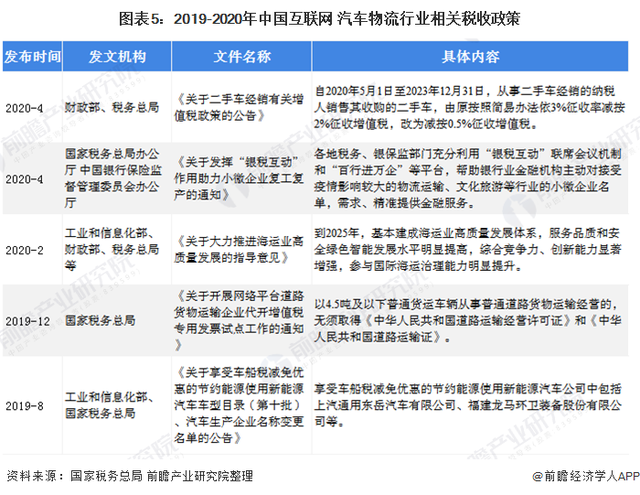 在稅收方面,國(guó)家政策對(duì)于汽車行業(yè)給予較大支持。2020年4月,《關(guān)于二手車經(jīng)銷有關(guān)增值稅政策的公告》指出,自2020年5月1日,二手車經(jīng)銷減按0.5%征收增值稅。二手車稅收的減征將有利于二手車銷售,推動(dòng)二手車汽車物流發(fā)展。《關(guān)于開展網(wǎng)絡(luò)平臺(tái)道路貨物運(yùn)輸企業(yè)代開增值稅專用發(fā)票試點(diǎn)工作的通知》指出以4.5噸及以下普通貨運(yùn)車輛從事普通道路貨物運(yùn)輸經(jīng)營(yíng)的,無(wú)須取得運(yùn)輸經(jīng)營(yíng)許可證和道路運(yùn)輸證,一系列稅收和程序便利化政策推動(dòng)網(wǎng)絡(luò)平臺(tái)道路貨物運(yùn)輸企業(yè)發(fā)展。